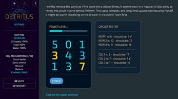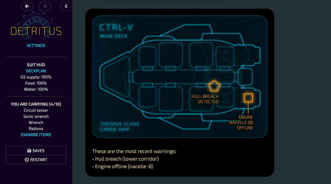 "With its slick graphical interfaces, soundtrack, multimedia effects and compelling sci-fi story, playing Detritus feels like playing a commercial-quality offering... This is unabashedly a game, rooted in exploration of a mystery but also requiring juggling certain resource management demands... Though it takes some time to come into its own, the story does not disappoint."